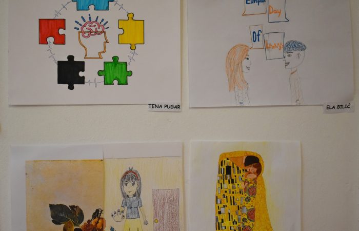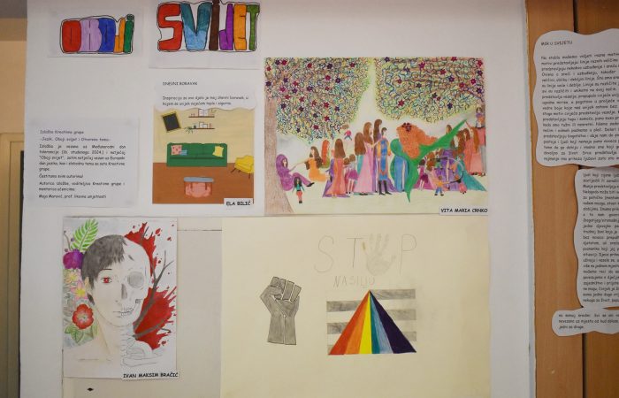 Naša je mala Kreativna grupa i ovo polugodište bila produktivna pa smo otvorili još jednu izložbu u predvorju škole. Nju zapravo čine tri zasebne teme: izloženi su radovi natječaja „Oboji svijet“ povodom Međunarodnog dana tolerancije; zatim radovi natječaja vezanog uz Europski dan jezika te djela nastala na satima Kreativne grupe (slobodna tema).