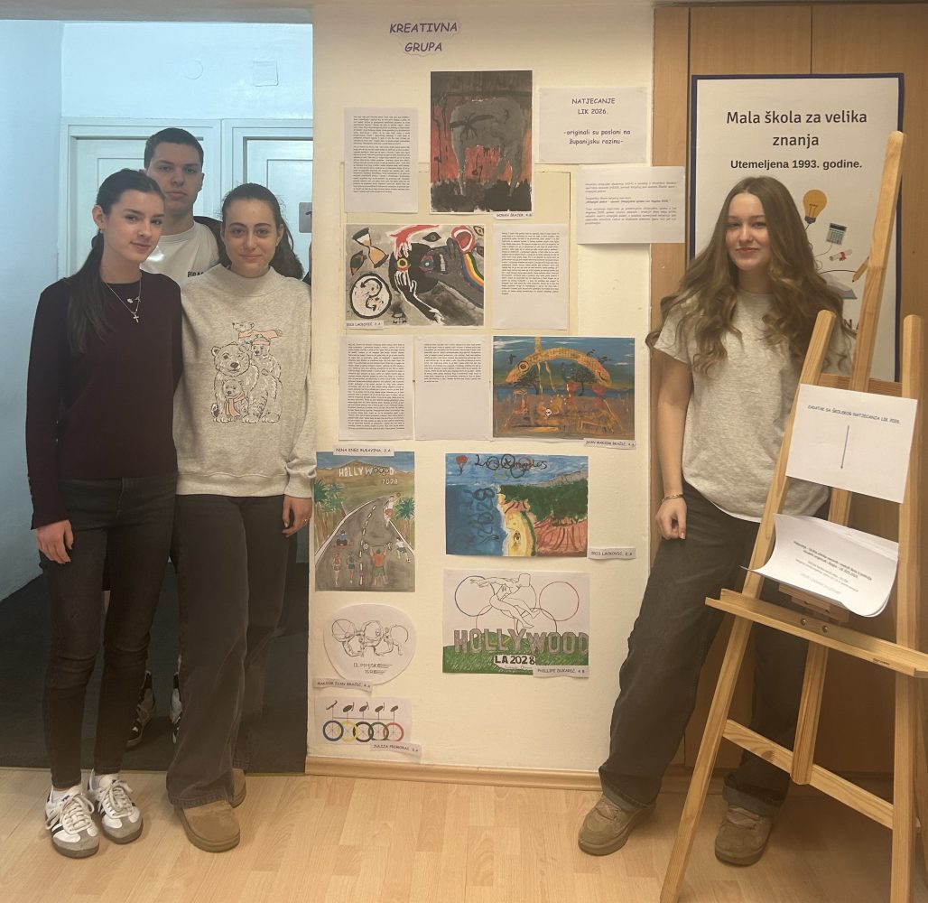 Naši su učenici ozbiljno pristupili istraživačkom zadatku, što je rezultiralo raznovrsnim radovima koji udovoljavaju temi, a tehnička im je izvedba na visokoj razini. Kreativni autori, kojima ujedno i čestitamo su Iris Lacković iz 2.a, Ivan Maksim Bračić iz 4.a i Goran Šrajer iz 4.b razreda. Njihovi su likovni radovi ostvarili najviše bodova na školskoj razini i dostavljeni su na županijsku razinu. Čestitamo i mentorici Maji Marović!