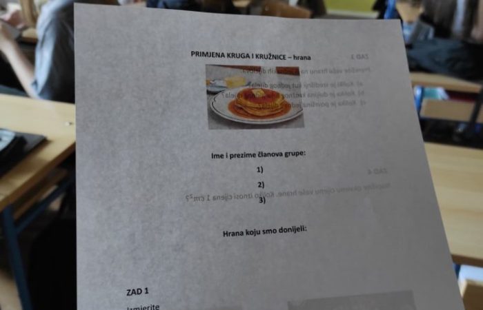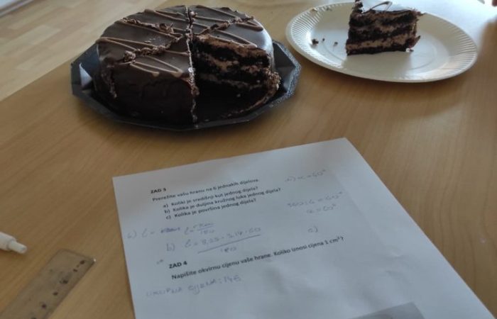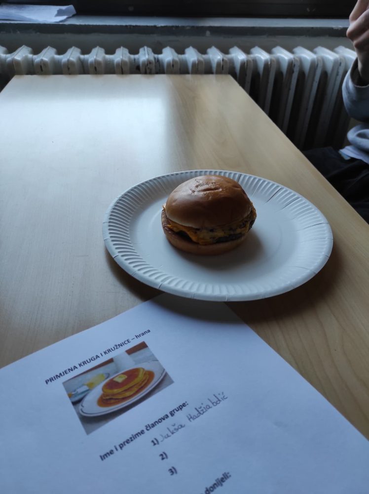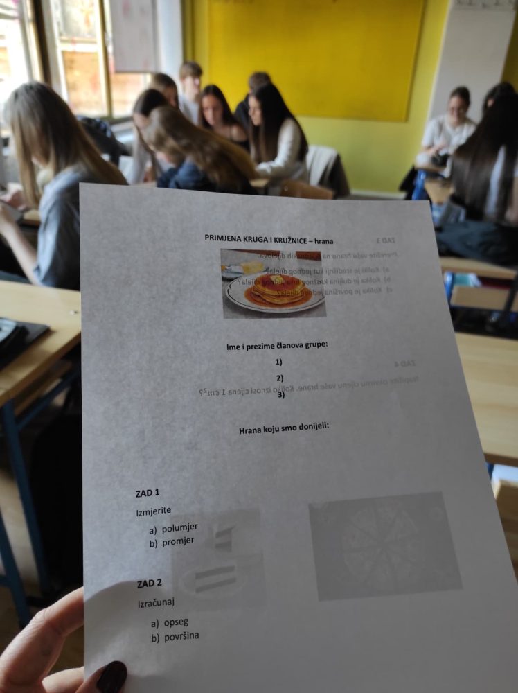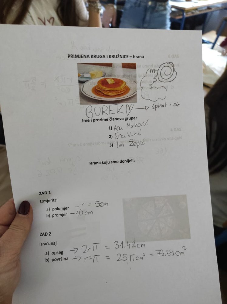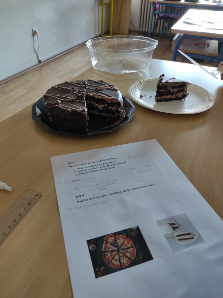 Učenici su bili podijeljeni u grupe i morali su na sat donijeti svoje omiljeno jelo u obliku kruga. Dobili su zadatke za koje su primijenili do tada naučene formule za opseg i površinu kruga, duljinu kružnog luka te površinu kružnog isječka.